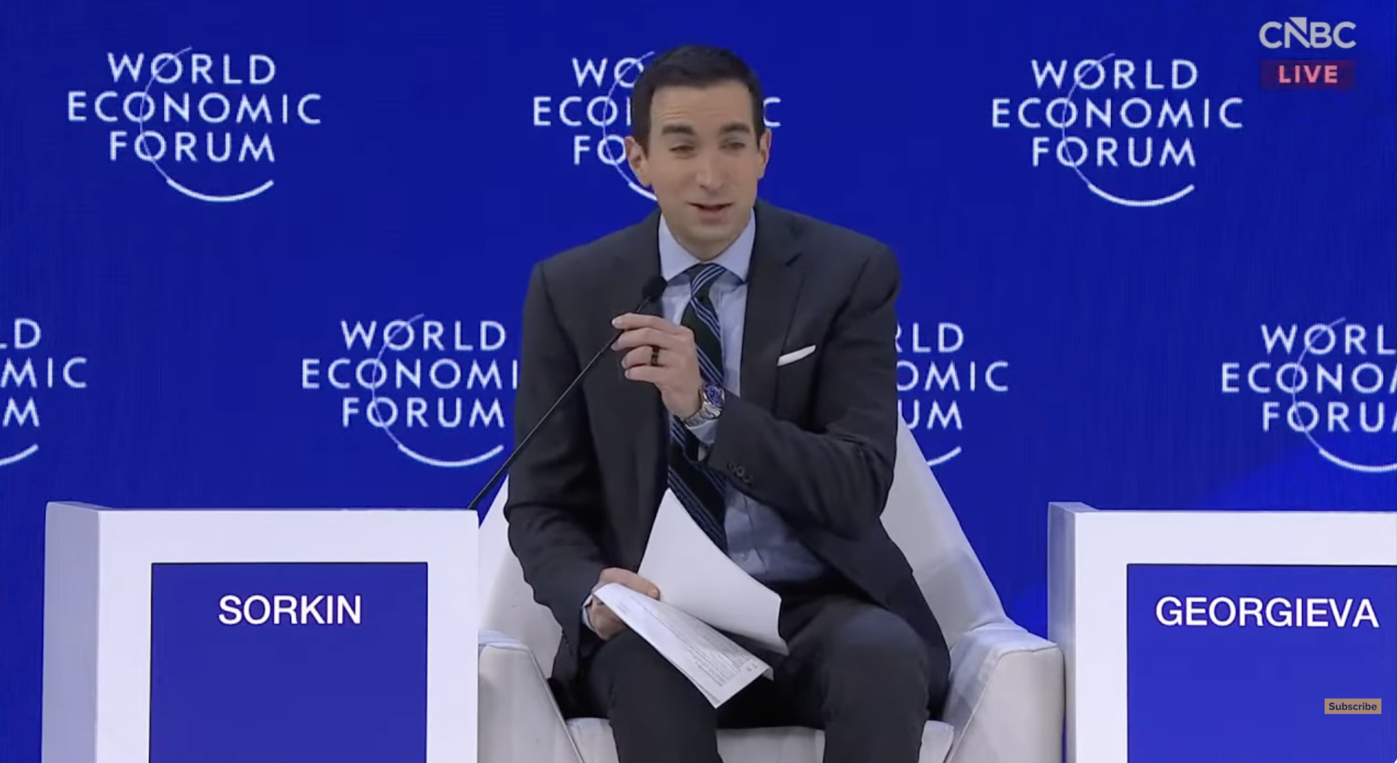 New York Times’dan Andrew Ross Sorkin, Davos’un en deneyimli sunucularından biri ve sahne dili tam anlamıyla bir “kadife çekiç” diyorlar. Yumuşak, zarif, hatta bazen neredeyse dostane görünen bir üslup; ama sorunun içeriği son derece sert. “The Big Picture: Global Markets and Policy” panelinde Christine Lagarde, Ken Griffin ve Larry Fink gibi isimleri aynı masaya oturturken, asıl gerilimi kuran sahnedeki ünvanlar değil, Sorkin’in çizdiği piyasa–politika hattı oluyor.